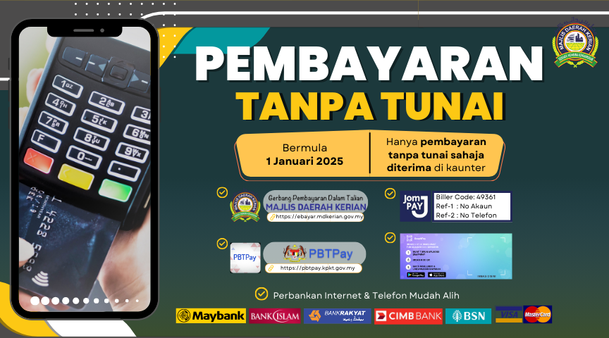 Bermula 01 JANUARI 2025 hanya pembayaran tanpa tunai sahaja diterima di kaunter Majlis Daerah Kerian. Jom sokong inisiatif tanpa tunai. Bersama kita melangkah ke arah masa depan digital!