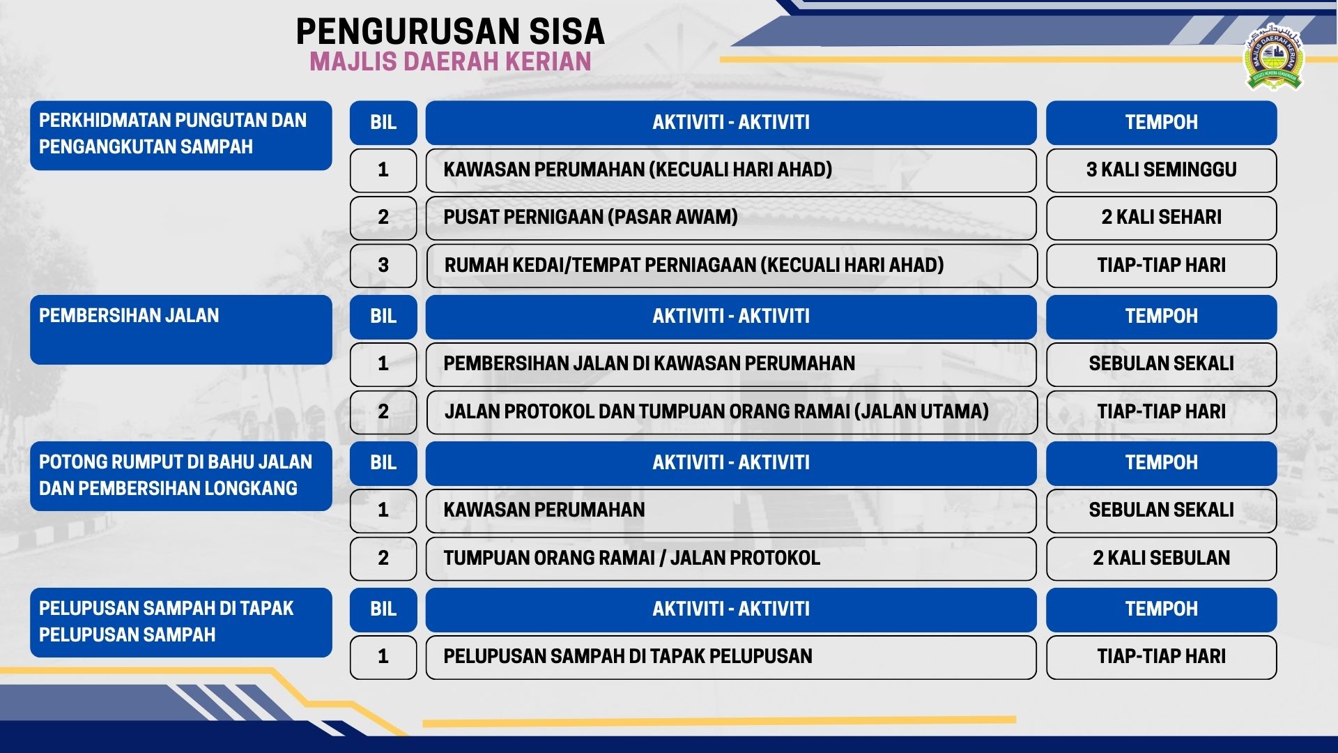 Jadual berikut menunjukkan aktiviti-aktiviti kutipan sampah dan pembersihan yang dijalankan di kawasan Kerian