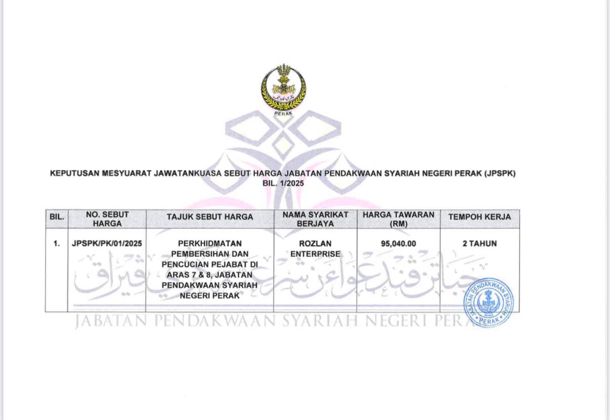 KEPUTUSAN MESYUARAT JAWATANKUASA SEBUT HARGA JABATAN PENDAKWAAN SYARIAH NEGERI PERAK (JPSPK) BIL. 1/2025