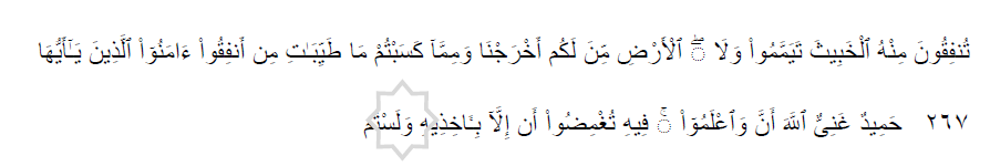 “Wahai orang-orang yang beriman! belanjakanlah (pada jalan Allah) sebahagian dari hasil usaha kamu yang baik-baik, dan sebahagian dari apa yang Kami keluarkan dari bumi untuk kamu, dan janganlah kamu sengaja memilih yang buruk daripadanya (lalu kamu dermakan atau kamu jadikan pemberian zakat), padahal kamu sendiri tidak sekali-kali akan mengambil yang buruk itu (kalau diberikan kepada kamu), kecuali dengan memejamkan mata padanya, dan ketahuilah, sesungguhnya Allah Maha Kaya, lagi sentiasa Terpuji.”